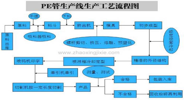 注:每個廠家所生產(chǎn)的PE管生產(chǎn)線設(shè)備的配置會有所區(qū)別,但總體的生產(chǎn)工藝流程基本上差不多,以下是詳細的工藝流程圖: